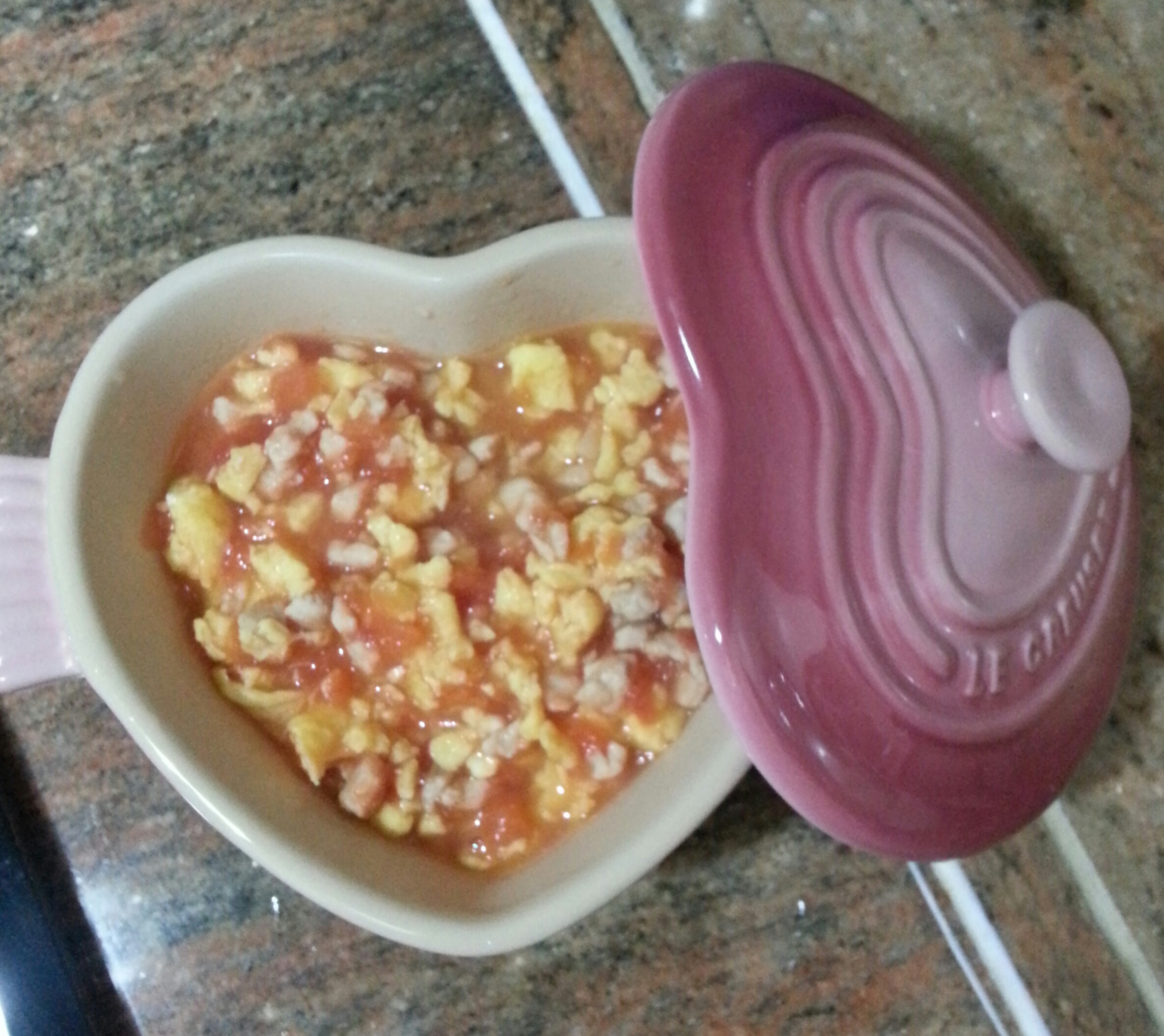 5. 燒熱鍋子,加少許油,加入蕃茄粒以及適量開水將蕃茄煮至適合寶寶的硬度,再加入雞肉和蛋,煮至雞肉熟透。